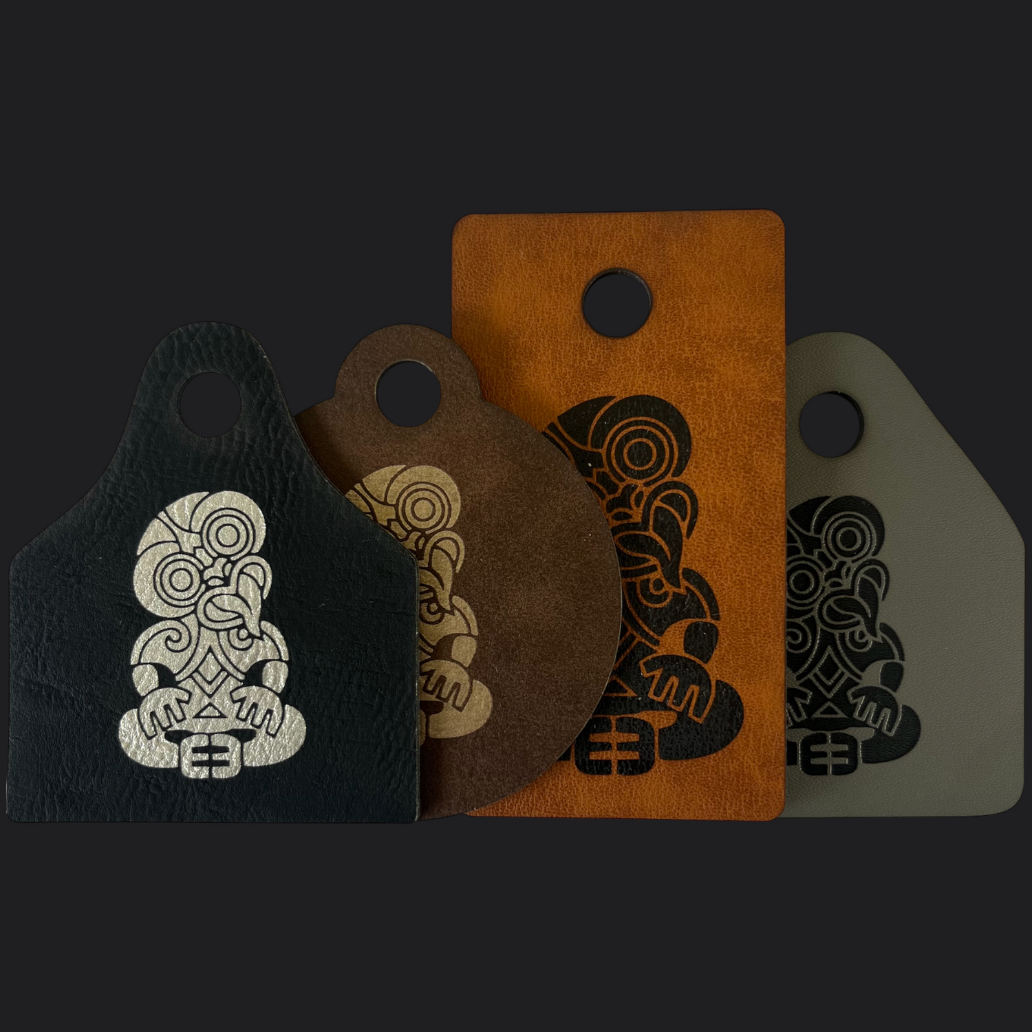 Durable faux-leather luggage tags with high-quality laser engraving. Multiple shapes, colours and engraving styles available.